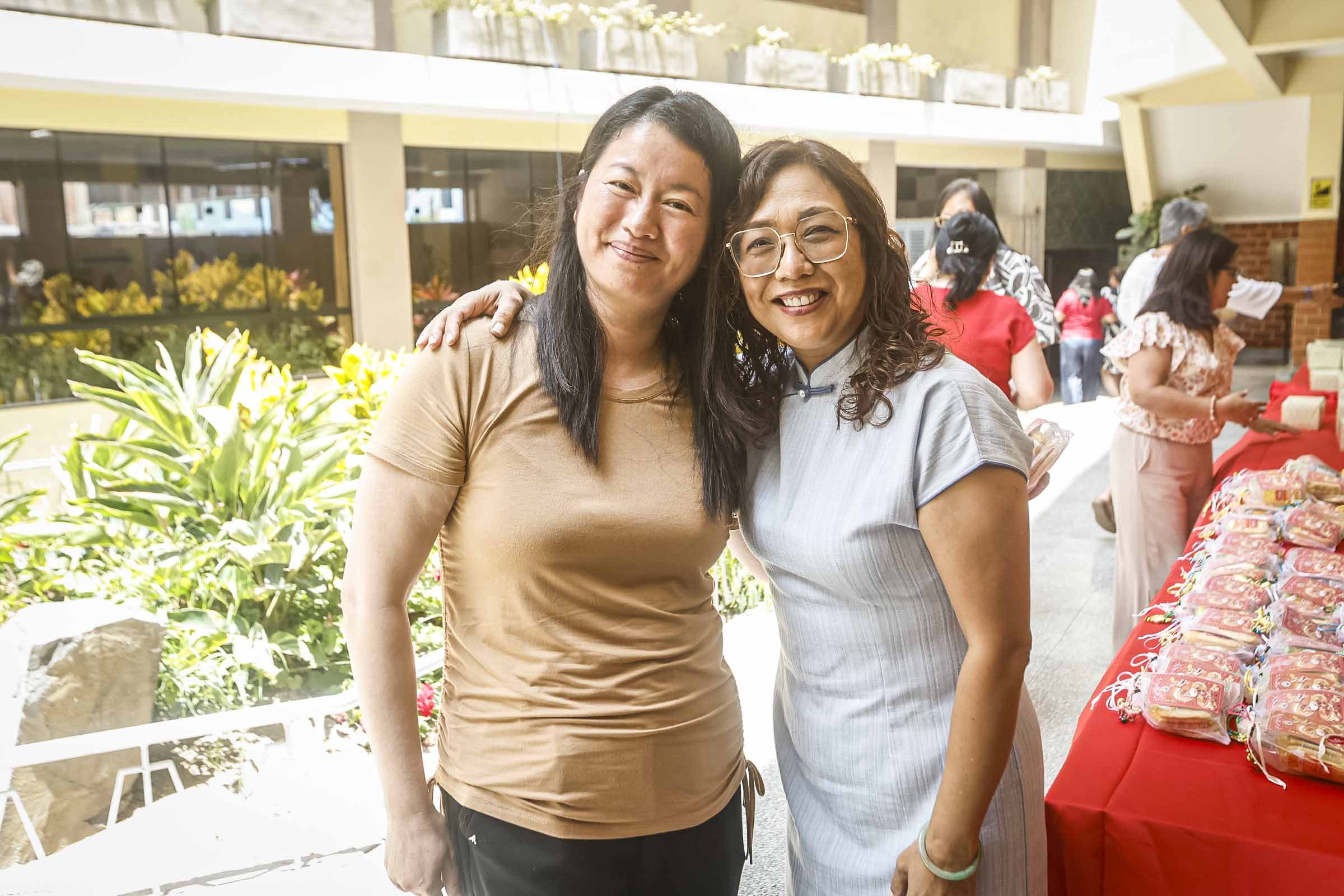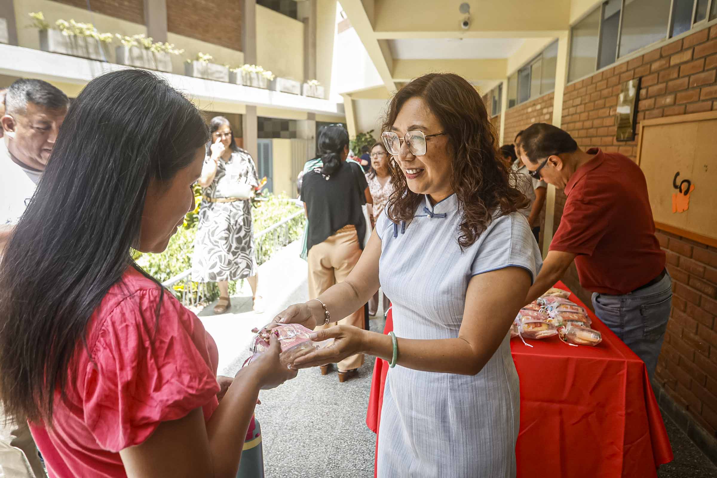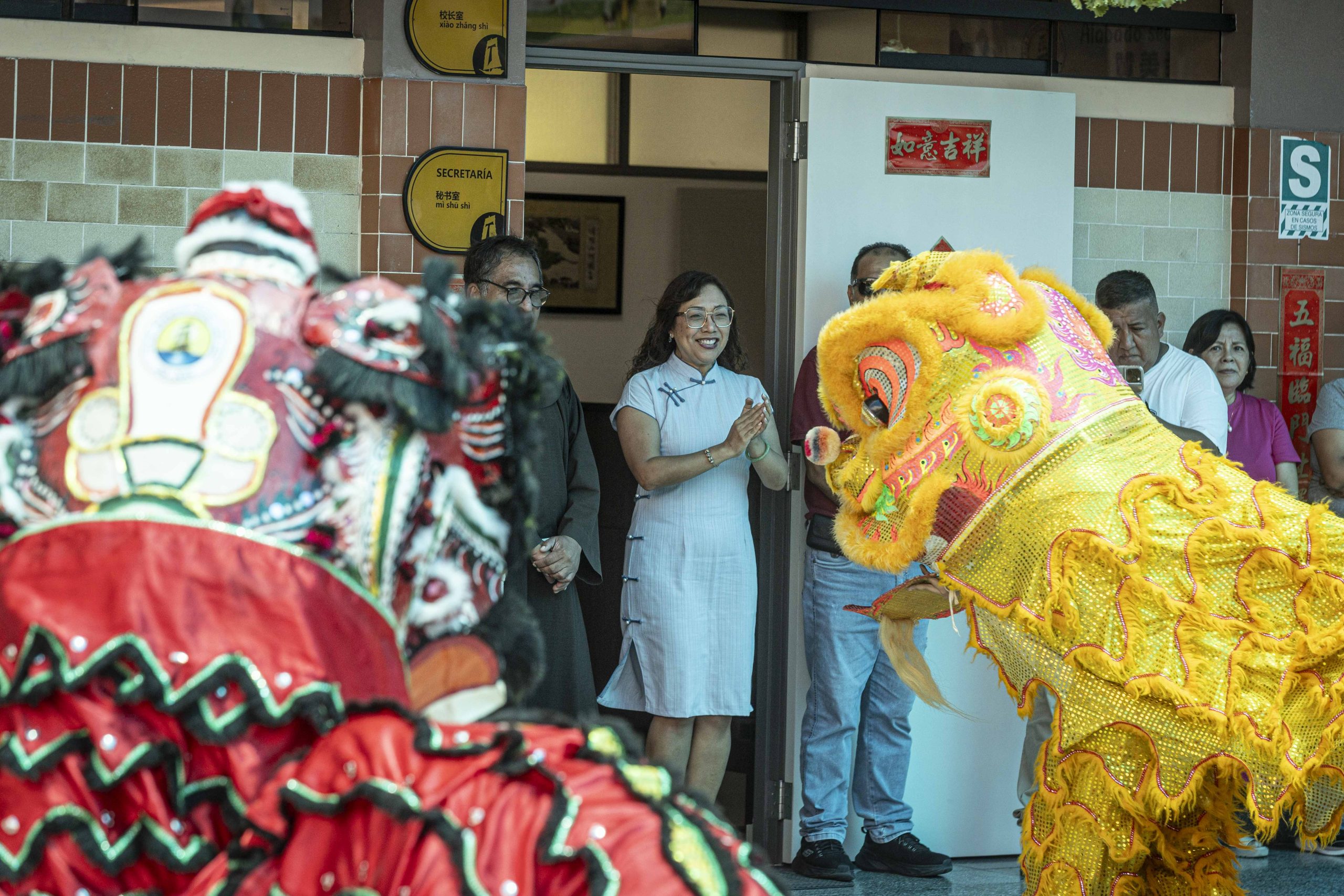 También se colocaron carteles con caracteres chinos, algunos invertidos, siguiendo la costumbre que juega con los significados sonoros para atraer la buena fortuna. Cada elemento dispuesto tuvo una intención simbólica, reforzando la idea del colegio como una casa común.