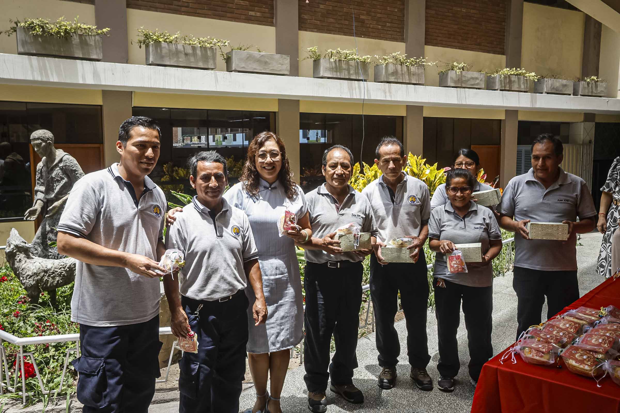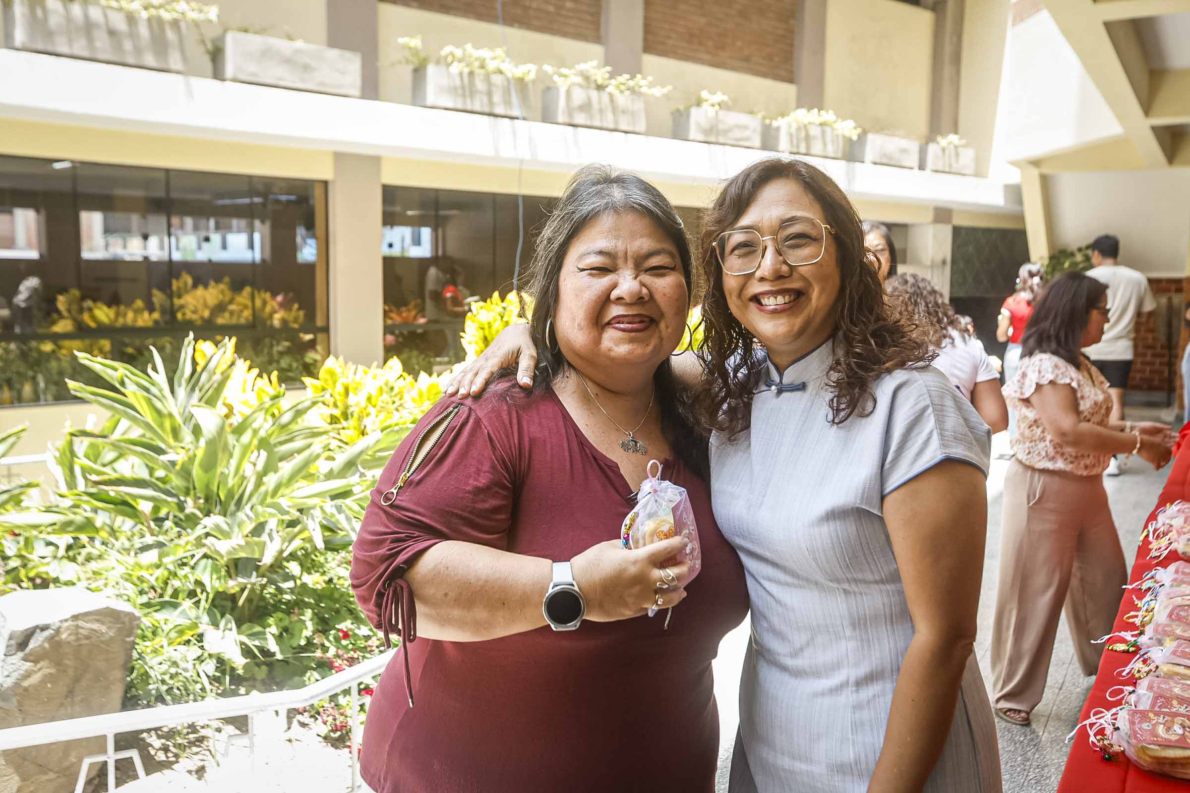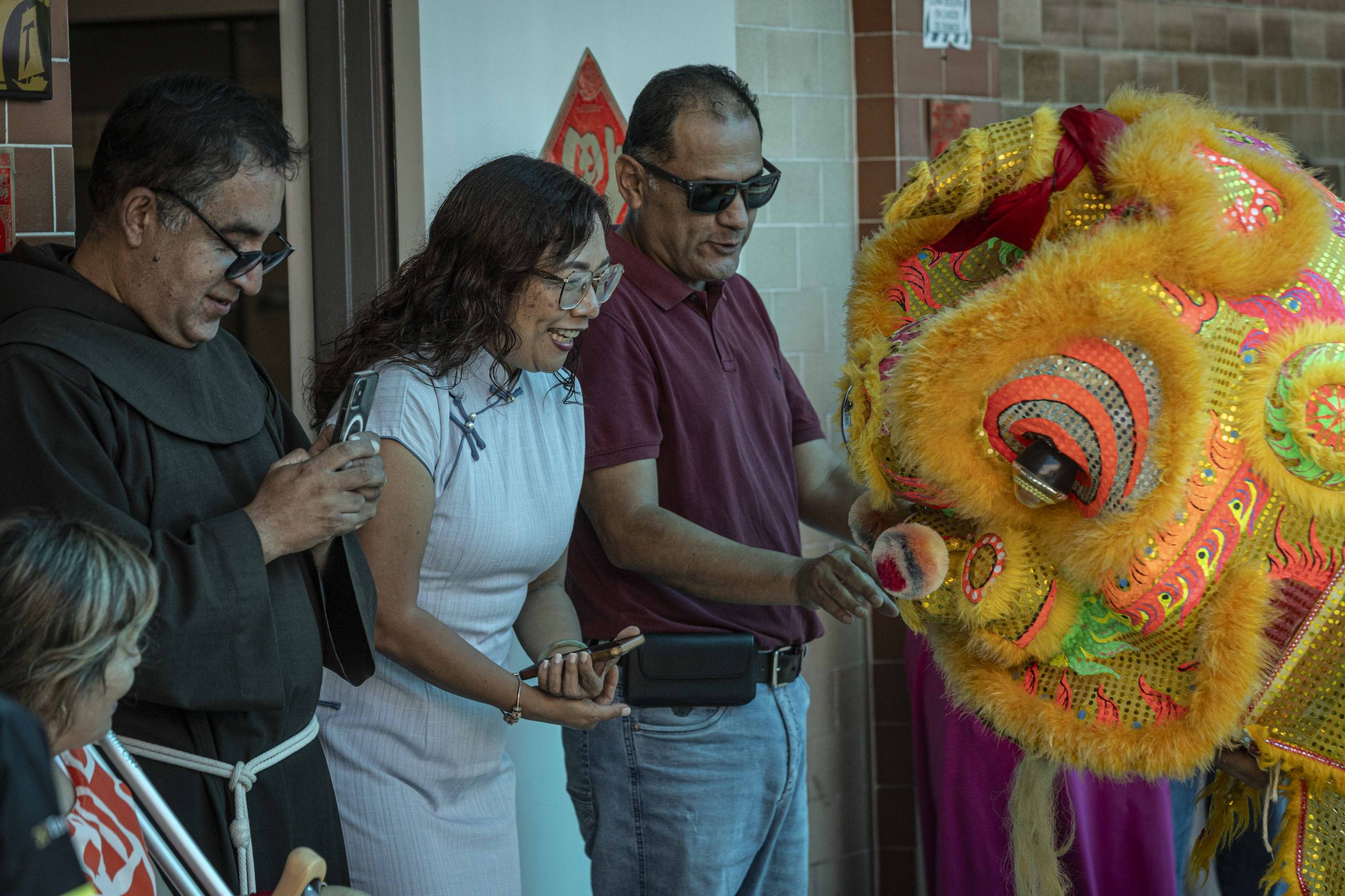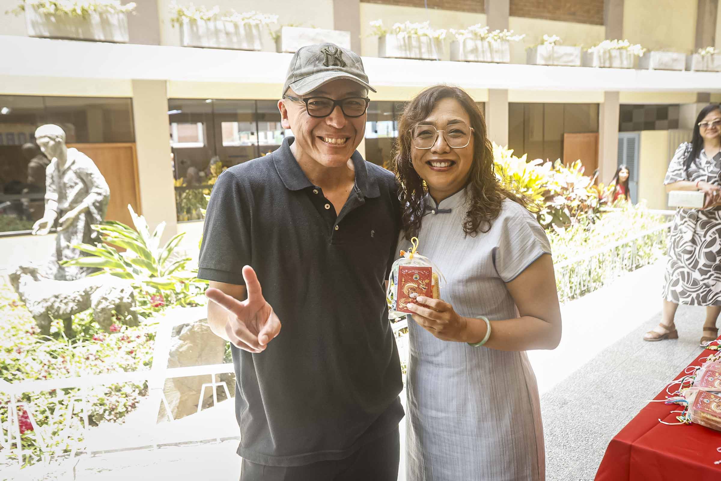 También se colocaron carteles con caracteres chinos, algunos invertidos, siguiendo la costumbre que juega con los significados sonoros para atraer la buena fortuna. Cada elemento dispuesto tuvo una intención simbólica, reforzando la idea del colegio como una casa común.
